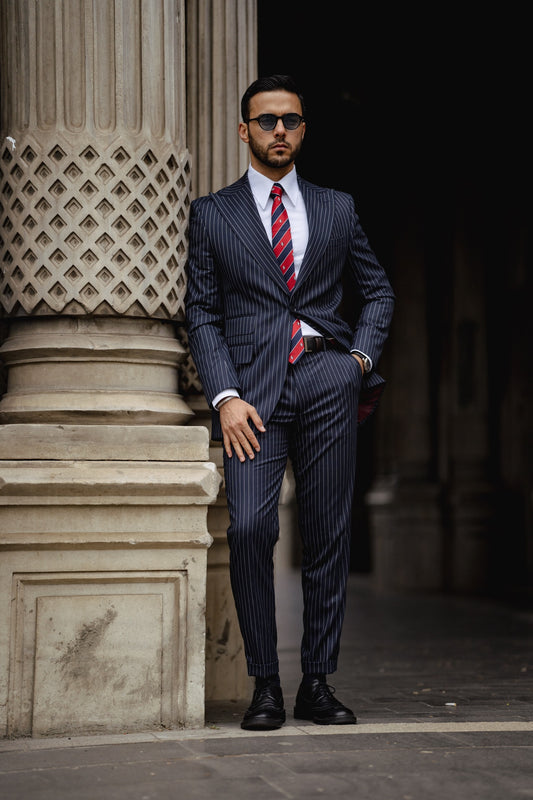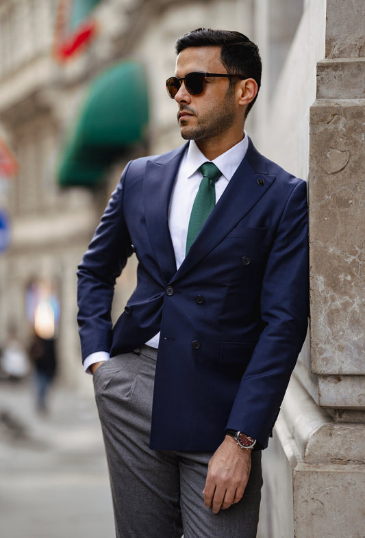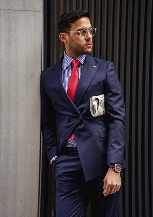 بدلة مزدوجة الصدر باللون الأزرق الداكن