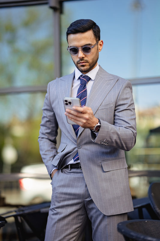 بدلة مزدوجة الصدر باللون الأزرق الداكن والرمادي