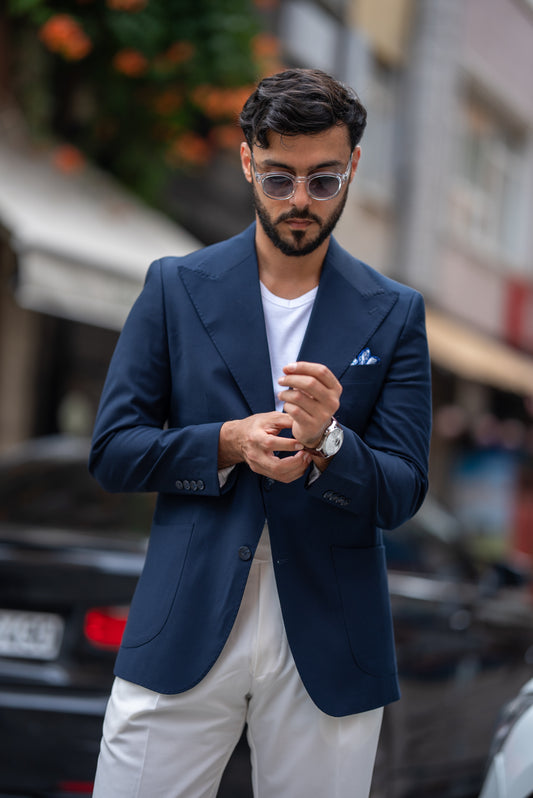سترة زرقاء داكنة ذات صف واحد من الأزرار