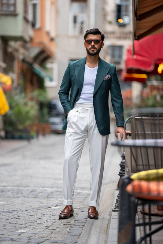 سترة خضراء داكنة ذات صف واحد من الأزرار